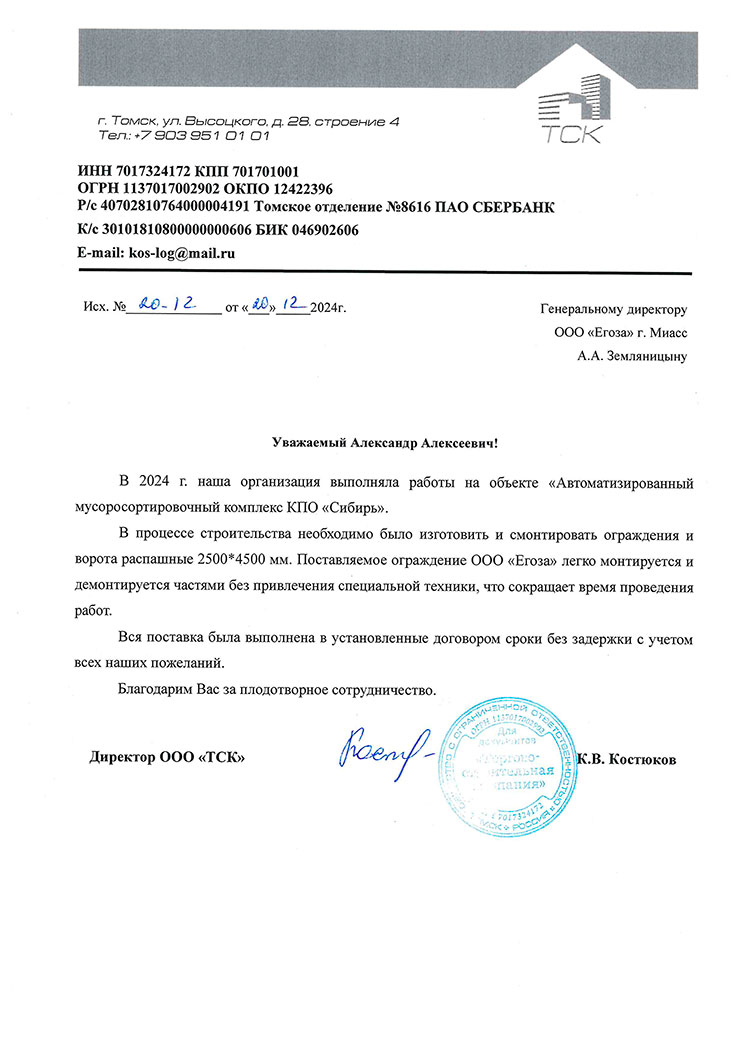 Уважаемый Александр Алексеевич! В 2024 г. наша организация выполняла работы на объекте «Автоматизированный мусоросортировочный комплекс КПО «Сибирь». В процессе строительства необходимо было изготовить и смонтировать ограждения и ворота распашные 2500*4500 мм. Поставляемое ограждение ООО «Егоза» легко монтируется и демонтируется частями без привлечения специальной техники, что сокращает время проведения работ. Вся поставка была выполнена в установленные договором сроки без задержки с учетом всех наших пожеланий. Благодарим Вас за плодотворное сотрудничество.