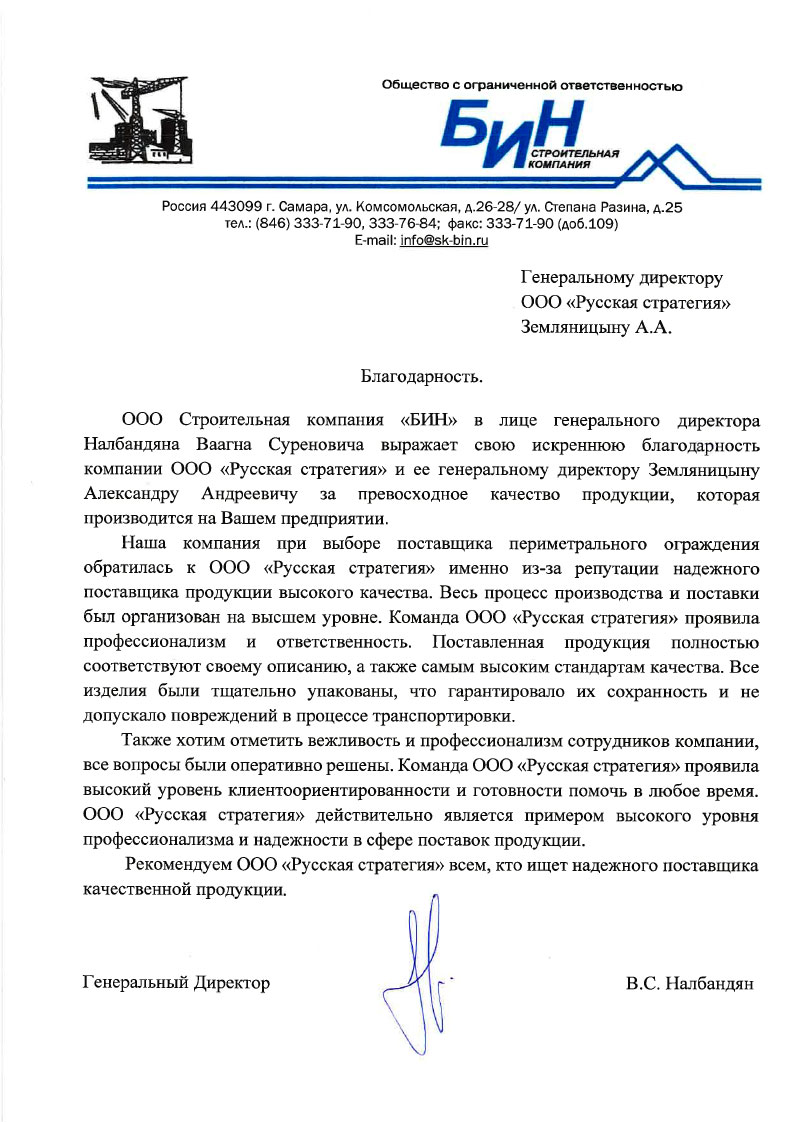 ООО Строительная компания «БИН» в лице генерального директора Налбандяна Ваагна Суреновича выражает свою искреннюю благодарность компании ООО «Русская стратегия» и ее генеральному директору Земляницыну Александру Андреевичу за превосходное качество продукции, которая производится на Вашем предприятии. Наша компания при выборе поставщика периметрального ограждения обратилась к ООО «Русская стратегия» именно из-за репутации надежного поставщика продукции высокого качества. Весь процесс производства и поставки был организован на высшем уровне. Команда ООО «Русская стратегия» проявила профессионализм и ответственность. Поставленная продукция полностью соответствуют своему описанию, а также самым высоким стандартам качества. Все изделия были тщательно упакованы, что гарантировало их сохранность и не допускало повреждений в процессе транспортировки. Также хотим отметить вежливость и профессионализм сотрудников компании, все вопросы были оперативно решены. Команда ООО «Русская стратегия» проявила высокий уровень клиентоориентированности и готовности помочь в любое время. ООО «Русская стратегия» действительно является примером высокого уровня профессионализма и надежности в сфере поставок продукции. Рекомендуем ООО «Русская стратегия» всем, кто ищет надежного поставщика качественной продукции.