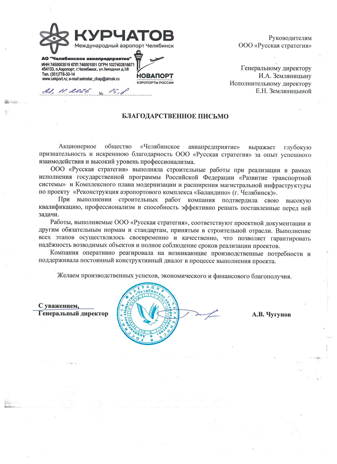 Акционерное общество «Челябинское авиапредприятие» выражает глубокую признательность и искреннюю благодарность ООО «Русская стратегия» за опыт успешного взаимодействия и высокий уровень профессионализма. ООО «Русская стратегия» выполняла строительные работы при реализации в рамках исполнения государственной программы Российской Федерации «Развитие транспортной системы» и Комплексного плана модернизации и расширения магистральной инфраструктуры по проекту «Реконструкция аэропортового комплекса «Баландино» (г. Челябинск)». При выполнении строительных работ компания подтвердила свою высокую квалификацию, профессионализм и способность эффективно решать поставленные перед ней задачи. Работы, выполняемые ООО «Русская стратегия», соответствуют проектной документации и другим обязательным нормам и стандартам, принятым в строительной отрасли. Выполнение всех этапов осуществлялось своевременно и качественно, что позволяет гарантировать надёжность возводимых объектов и полное соблюдение сроков реализации проектов. Компания оперативно реагировала на возникающие производственные потребности и поддерживала постоянный конструктивный диалог в процессе выполнения проекта. Желаем производственных успехов, экономического и финансового благополучия.