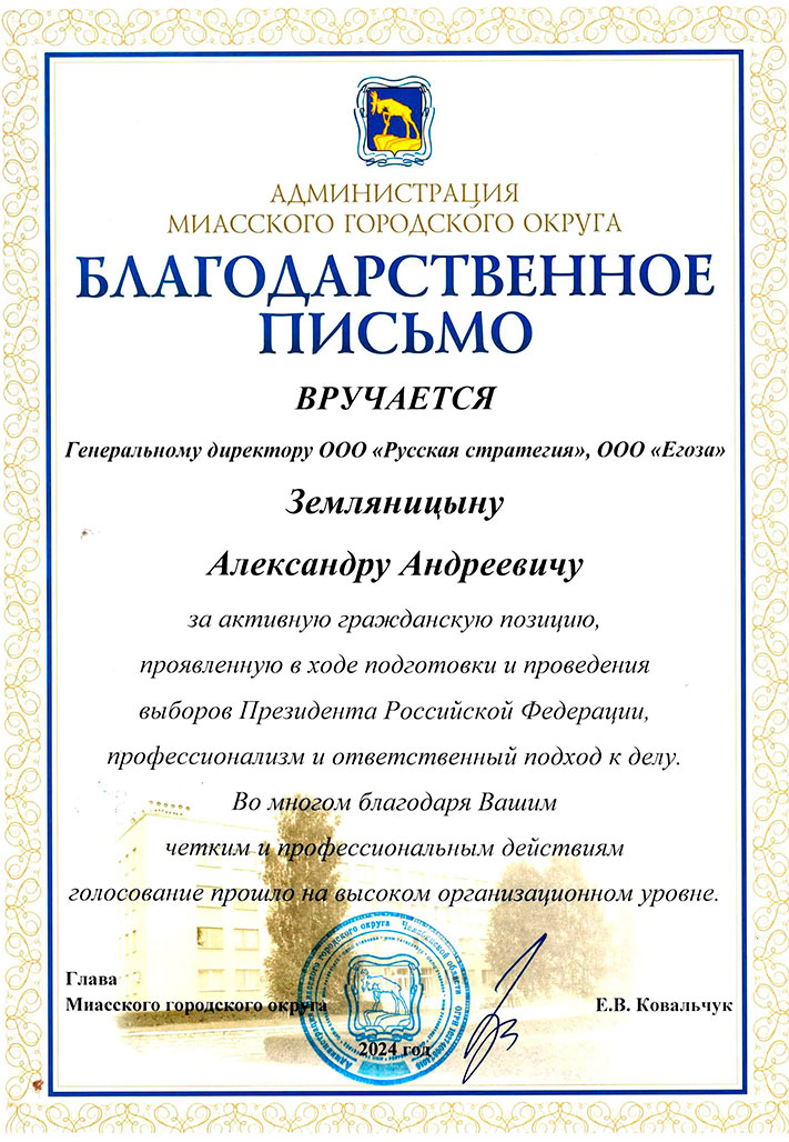 БЛАГОДАРСТВЕННОЕ ПИСЬМО Генеральному директору ООО «Русская стратегия», ООО «Егоза» Земляницыну Александру Андреевичу за активную гражданскую позицию, проявленную входе подготовки и проведения выборов Президента Российской Федерации, профессионализм и ответственный подход к делу. Во многом благодаря Вашим четким и профессиональным действиям голосование прошло на высоком организационном уровне. Глава Миасского городского округа Е.В. Ковальчук, 2024 год.
